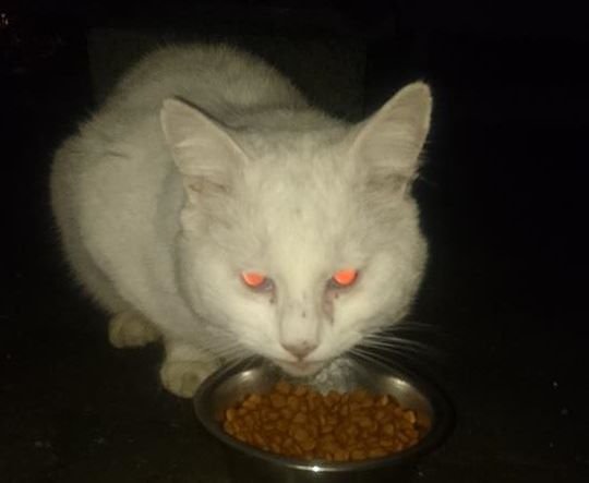 Det er en korthåret hvit hankatt som har begynt å henge hos oss. Er ikke chippet. Helt hvit, med blå øyne, og er sannsynligvis døv. Er tam, men reservert. Ser ut til at den har gått ute en stund. Er tatt inn nå.