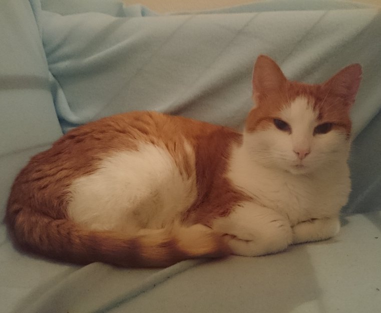 8 år gammel hannkatt i liten/vanlig størrelse. Rødbrun pels på ryggen og halen, hvit pels under magen. Den er ID merket/chippet med tatovert merke i det ene øret.