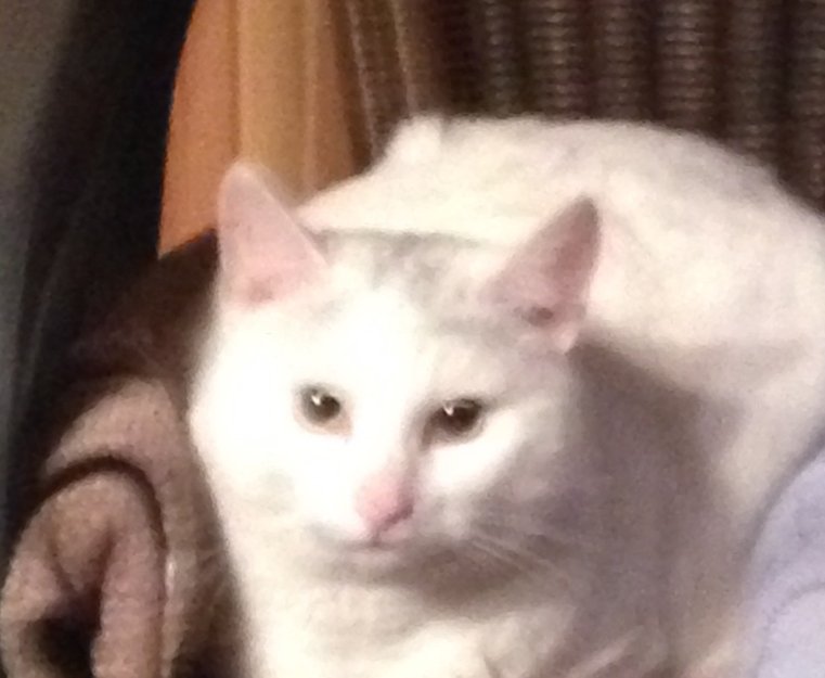 Det er en kasterert hann katt ca 5 år. Helt hvit med et lite lysegrått parti på hodet. Han har chipp.