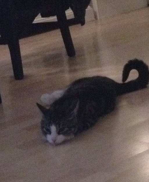 Han e rundt et år gammel og har veldig fin øyner og er en vennelig katt. Han har tatoovering i øren som viser at han er id merkert. Han har en hale som krøller seg