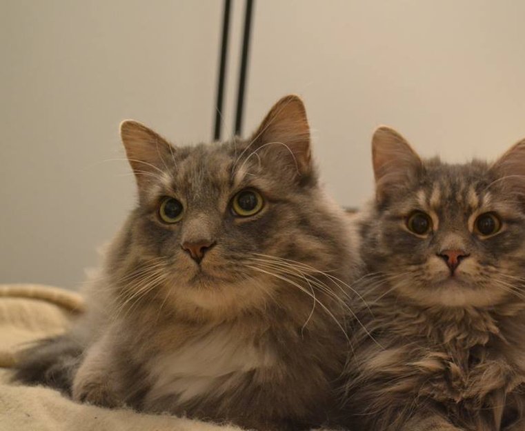 Konrad er katten til venstre, han er en stor hankatt på 7,8 kg. Hvit på potene og i halsen, han er rund og god. Han er sølvfarget med hvite striper. Han bærer en rosa halsbånd med navet og nummere mitt på. Han er menneske sky, så han oppsøker sjelden noen han ikke kjenner.