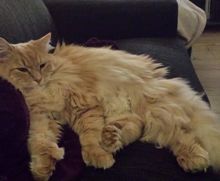 Simba er en uvanlig stor pus på rundt 7-8kg som er semilanghåret og skipskatt på alle 4poter. Han er kastrert, chippet og registrert og vaksinert. Han er veldig sky og redd voksne, men veldig glad i unger, sålenge de ikke er for brå. Simba er blanding mellom Main coon og skogskatt og er derfor større enn normale skogskatter. Han minner mer om Main coon i størrelse. Han har brune øyne og en pitteliten hvit flekk på ryggen av sin rosa nese. Han har hvit underpels og lysebrun overpels. Han er hvit hele veien fra under nesa og til haletippen via brystkassa og magen. De hvite hårene på magene krøllete.