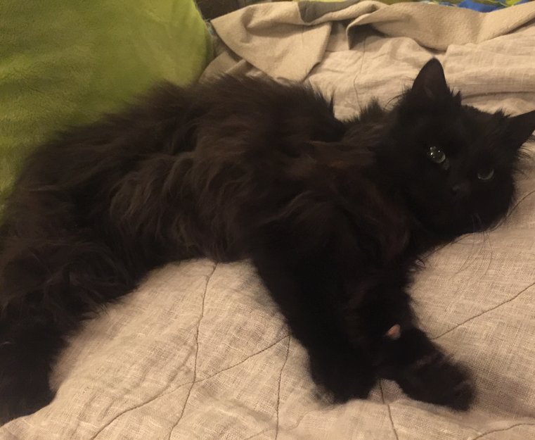 Liten katt, pent litet fjes, grønne vakre øyne, rel lang nos, langhårete pels med innslag av norsk skogskatt m hår poter og ører, svært flokete pels som ligger som et tykt teppe lengs ryggens sider. Må sannsynligvis barberes for å få orden på pelsen iigjenn. Ser ut til å ha vært ute lenge .