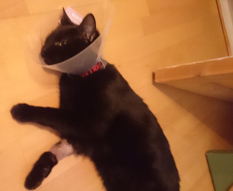 Smatt ut av døra med halskrage på. Barbert og sår på høyre fremfot. Chippet. Trenger medisiner!