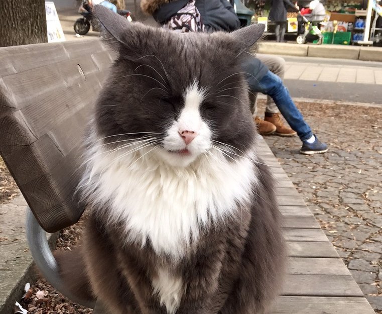 Den er ikke tynn og pelsen virker fin. Katten har noen grå hår i pesen så jeg tror at den er en eldre katt. Den hadde ikke bånd, jeg la ikke merke til noe merkinger. Den er snill mot mennesker og lar deg klappe den i ett par minutter om gangen, så jeg fikk ikke sjekket om den hadde merkinger i øret.. Det er en rolig katt som ikke purrer. Den sitter og venter på benken.