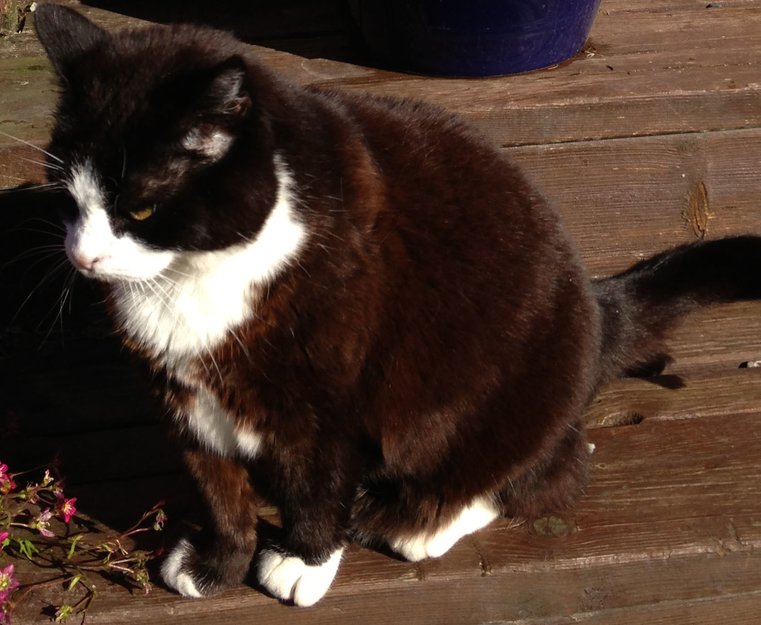 Er mest sort, hvite felter som på bildet og på magen. Ikke brun i pelsen nå. Sort felt under haka. Bittelite sort på venstre side av nesebor. Sky og forsiktig.