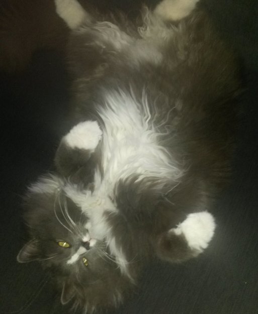 Han er grå og hvit.(hvit på brystet under magen og på bena) Ekstremt langhåret med stor grå hale og sort nese.
