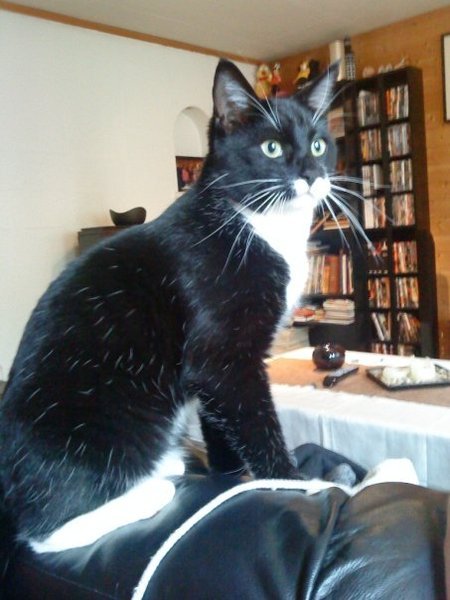 Svart og hvit hannkatt med hvite hår i den svarte pelsen. Umerket da han mistet halsbåndet sitt like før han forsvant. Liker ikke fremmede.