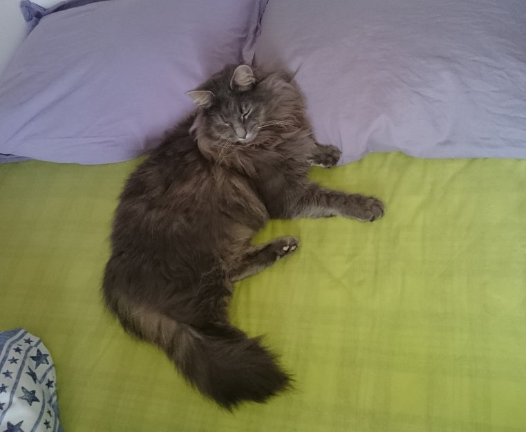 Han bærer halen oppover ryggen, kraftig fin hale. Løvemanke rundt halsen. Snart 3 år og stor gutt på 5,5 kg.