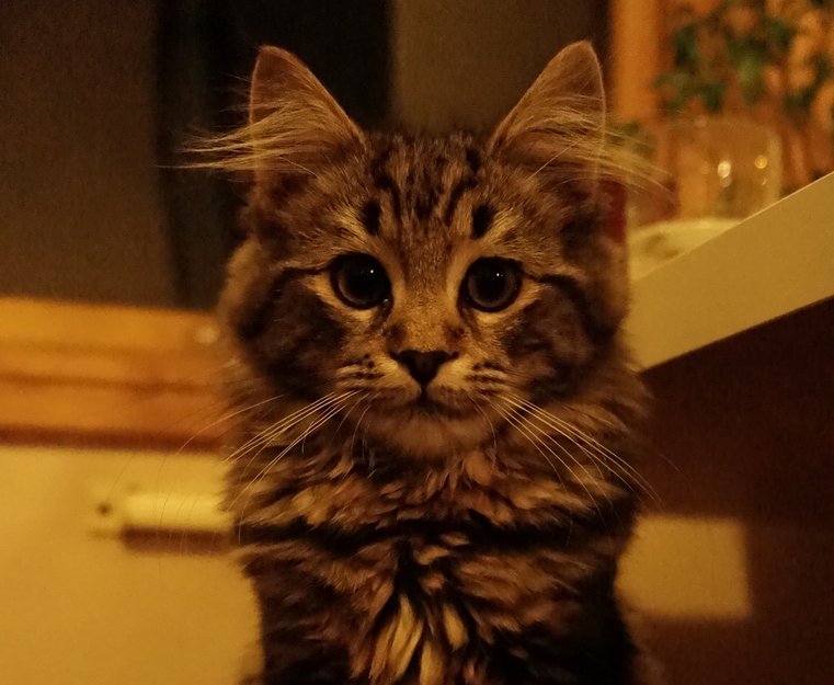 Hun har blitt barbert på høyreside ved hoften. Er et år, så ikke den største pusen i gaten. Har litt øyebetennelse, så er til tider litt hvit, evt. litt rød i øyekroken mot nesen. Stor pjuskete hale.