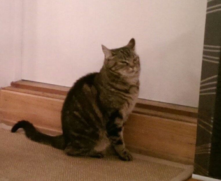 Brunstripete, korthåra norsk skogskatt. Lys ved munnparti, hake og på magen. Den er litt sky for ukjente, men den er vant med å vera inne og er heilt stuerein. Den går på do kun ute eller i strøkasse.