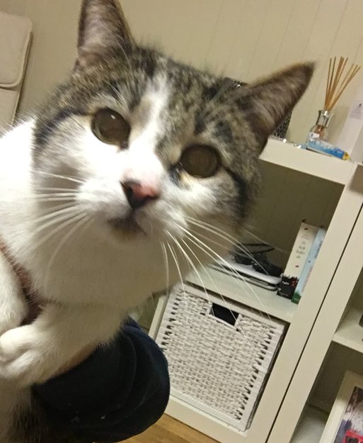 Var ute å gikk tur, denne katten møtte jeg ved Eltonåsen skole. Den fulgte meg helt hjem til døra, har stått utenfor døra mi helt siden turen og mjauet. Katten er veldig kjærlen. Stor katt, vi tror det er en kastrert hannkatt. Brun og svart spraglete pels. En stor brunflekk ved halefestet. Hvite bein og hvit krage.