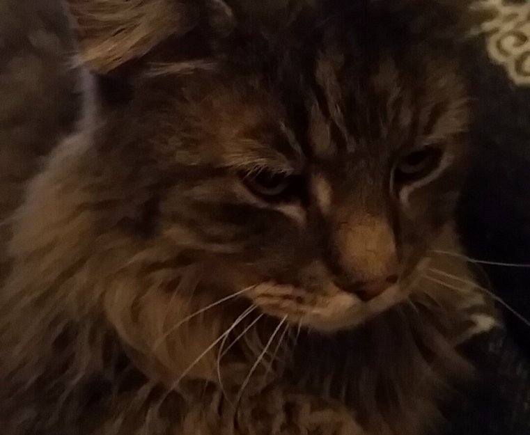 Nydelig hannkatt som er blanding av skogskatt og vanlig huskatt. Langhåret. Har hatt en operasjon i eine bakfoten for 2 år siden, der han har ei skinne. Veldig tillitsfull og kosete katt på litt over 6 år.