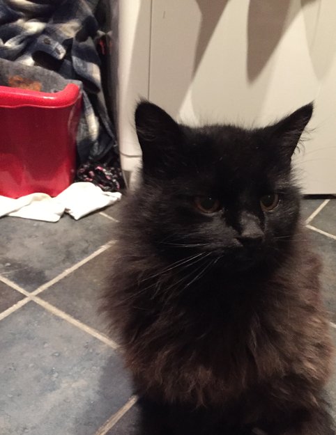 Pelsen er helsvart/noe gylden. Katten mangler en hjørnetann.