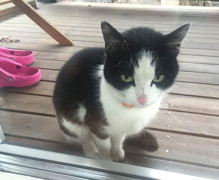 Den har vært i nærområdet i flere dager i følge nabo. Den er plassert i midlertidig hjem nå. Chip blir sjekket tirsdag.