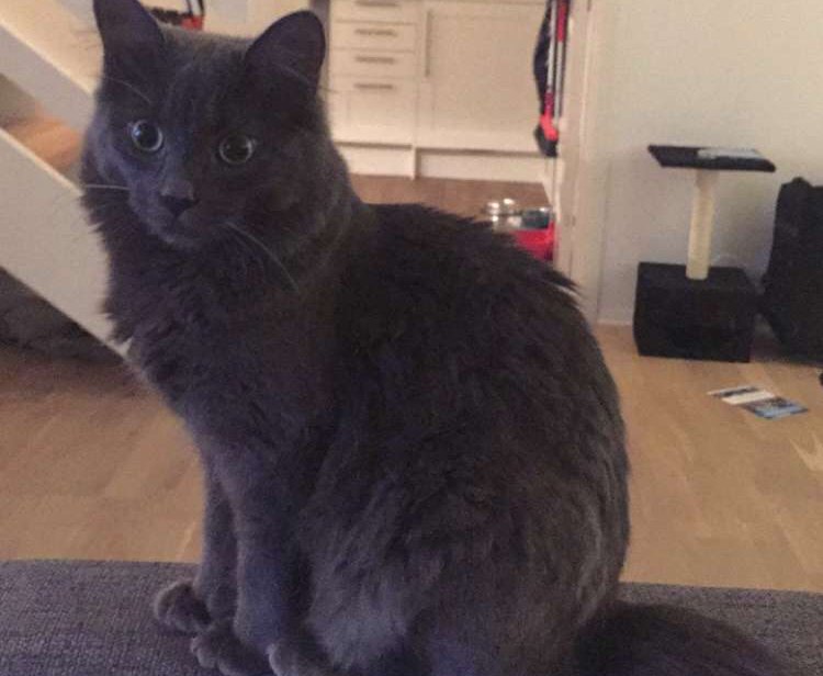 Noe langhåret, veldig fluffy hale. Helt grå. Har chip, men ikke tatovering i øret.