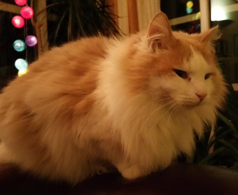 Halvt huskatt, hvit på labber og buk. Beige/lys rød pels ellers. Litt løvemanke. Veldig kjærlig, tillitsfull, sosial og nysgjerrig. Maler høyt bare man snakker til ham.