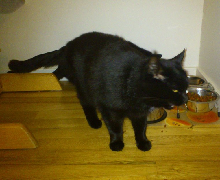 Guinness er sort med noen få hvite strå på brystet. Han er veldig kontaktsøkende og kommer gjerne frem og hilser.
