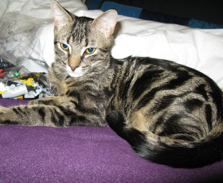 Darwin er ca. et år (adoptert fra Dyrebeskyttelsen) Han er slank og har lang hale. Og har en silkebløt pels. Han er veldig sosial og tillitsfull med mennesker og andre katter, så jeg regner med at han vil søke mennesker igjen. Han er chipet men ikke øremerket.