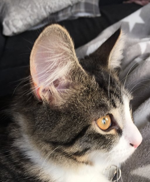 Har brunstripet pels med gulorange områder. Den ene fremlabben er delvis hvit og brunstripet, slik at det ser ut som han har t skjorte på seg.