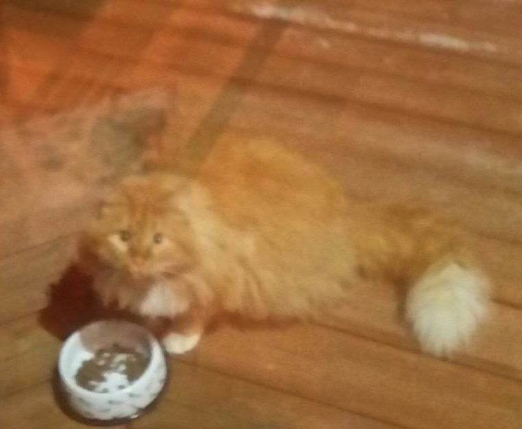 Rød med hvitt bryst, poter og haletipp. Litt mørkere rød rundt nesen. Litt sky, har ikke fått vært borti den ennå, men virker ikke helt vettskremt heller.