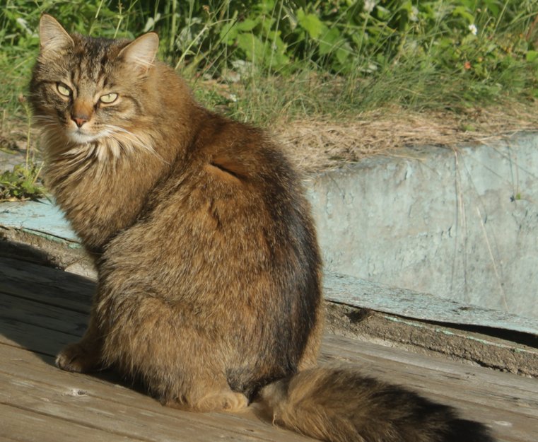 Litt svart på ryggen, og kan se ut litt som en rev i fra visse vinkler pga tjukk og spraglete pels/hale (sett bort fra lengde/størrelse). Pusen er slank, muskuløs og smidig. Veldig menneskekjær.