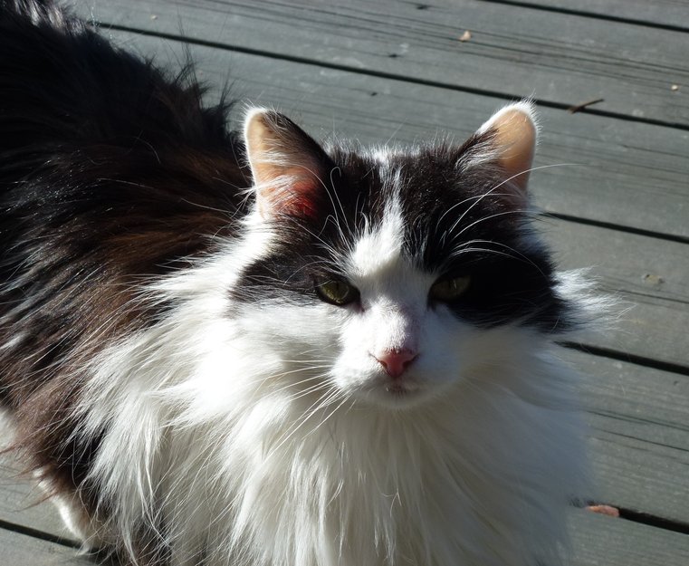 Langhåret, ganske stor, halvdeler hvit og sort, kjælen men skeptisk til fremmede. Er vant til å løftes.