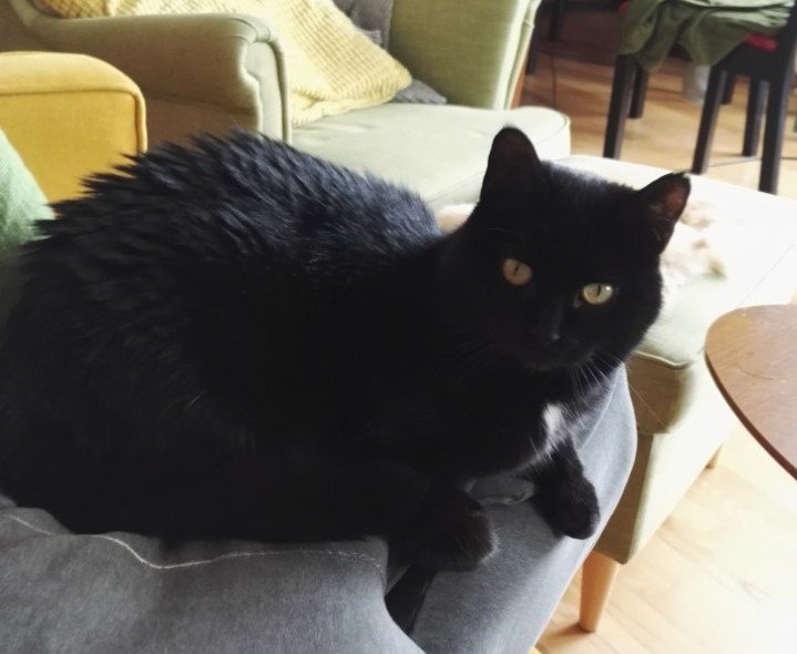 Hun er en sort katt med et lite hvitt område midt på brystet. Hun er liten av vekst ca 3,5 kg.