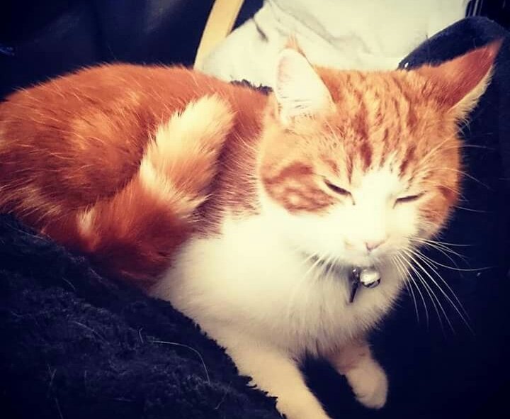 Har halsbånd med bjelle og lapp med navn å nr klistremerker på.