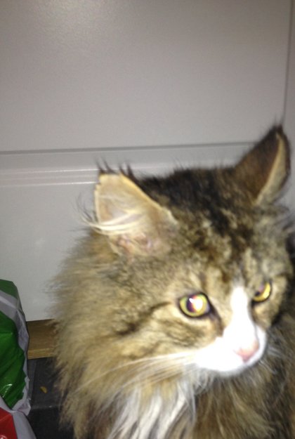 Katten gikk utenfor og gråt så fælt i natt at jeg måtte ta den inn. Den har veldig tovet pels, var veldig sulten, og stinker urin. Den er ganske kjælen og tillitsfull. I følge dyrlegen en ung ukastrert hannkatt som dessverre ikke er chipmerket.