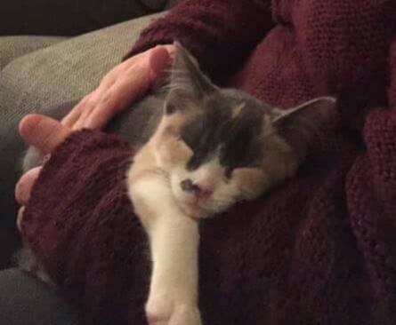 Hun er veldig sosial og kosete og ikke særlig redd av seg. Hun er grå og hvit med lys oransje/brune flekker. Hun er 6 måneder gammel.