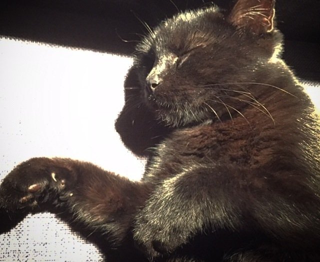 Helt sort. Middels stor. Relativt nylig sterilisert.
