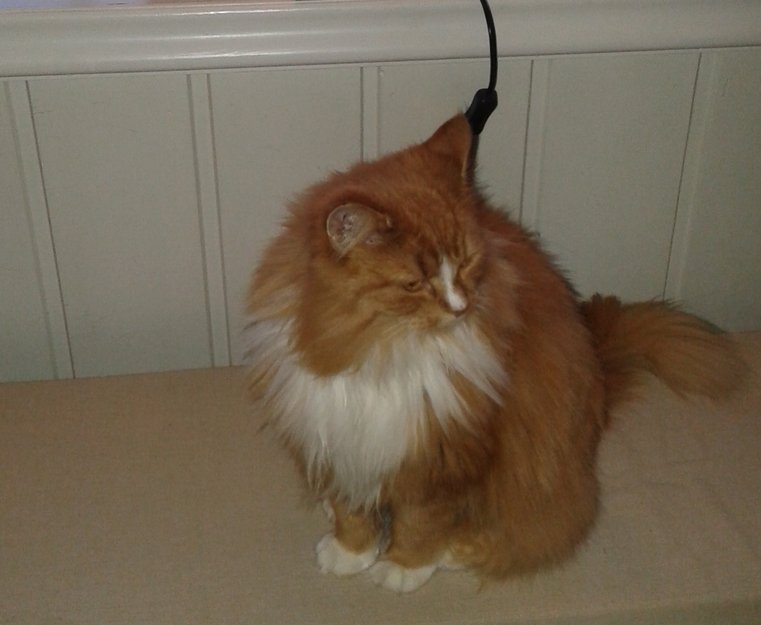 Hun har lang orange og hvit pels, hvit bles i ansiktet, og hvite "sokker". Hun har ID merke i øret. Hun er veldig kontaktsøkende og kosete, og nysgjerrig.