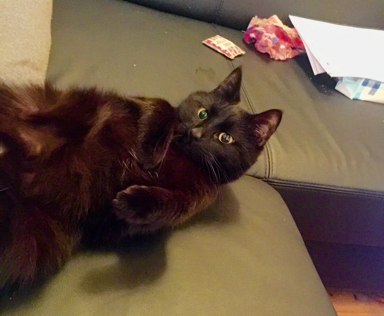 Svart med noen hvite hår på brystet og et hvit hår i hvert øre. Han har gule øyne også er han veldig sky.
