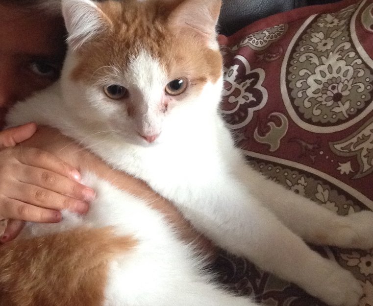 Han var ikke ute før og er redd. Pussi er en søt skipskatt, oransje og hvitt med merke ved øynene.
