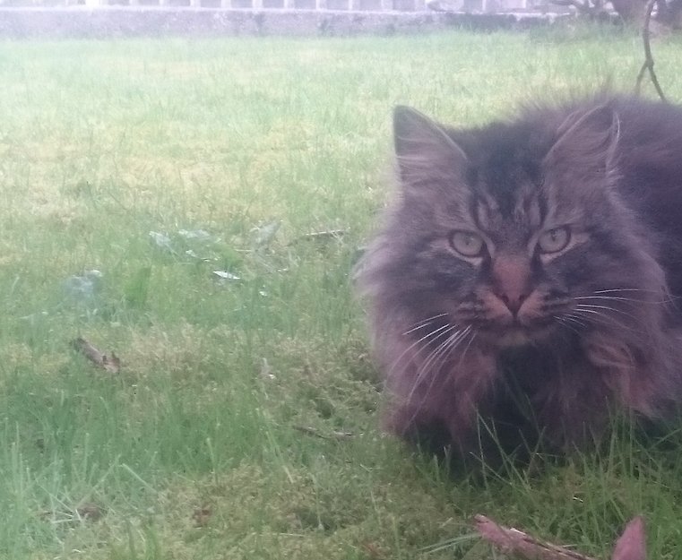 Nydelig, langhåret katt, med store, særegne, gule øyne. Nå er den veldig pjusk og har mistet en del pels. Ligner skogkatt, men har et "spesielt" fjes. Den er middels stor, virker ung voksen. Den er redd, men merker den er tam/ vandt med folk. Den har nok blitt litt vill og redd på sin ferd. Jeg tror det er en jentepus, men får ikke ta i den foreløpig så kan ikke sjekke det.