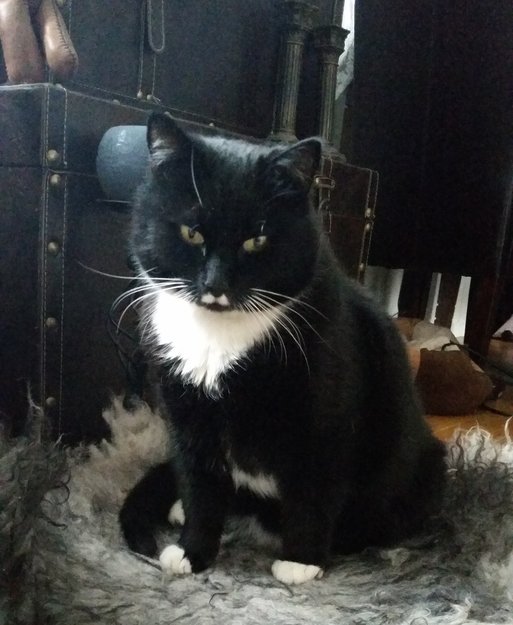 Han har hvit bart og er en veldig stor katt. Svart med hvitt bryst og hvite poter