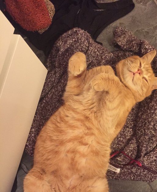 Det er tatovert ID i øret hans. Pelsen er rødlig med noen tigerstriper i lys pels. Den har en hvitere haletupp