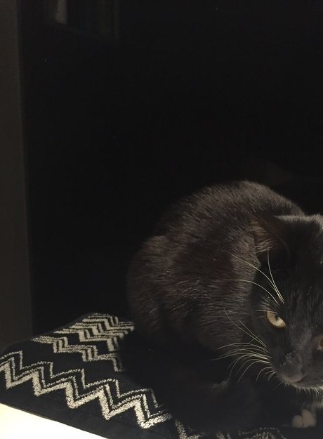 Svart, med hvitt "skjegg og sokker". Har halsbånd med telefonnummer