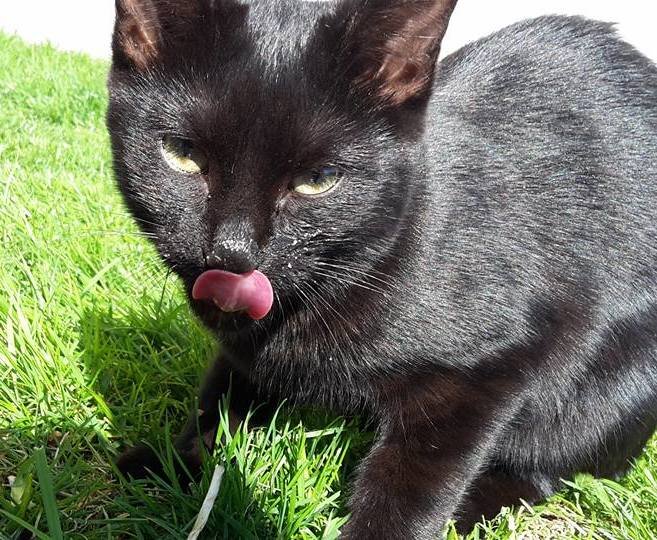 Svart sulten kattunge kom mot meg mens jeg var i hagen. Den har ingen chip og jeg strever med å finne eiren/ene. Katten har spisse ører, gule øyne og her helt svart borsett fra en tynn (nesten ikke synelig) hvti stripe på halsen/brystet. Er kosete og virker sulten.