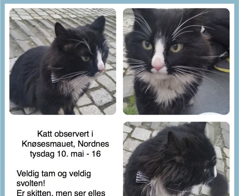 Eg har ikkje høve til å ta han inn grunna smittsom katt heime, men gir han mat ute. I følge naboar har han visst vore her ei stund.