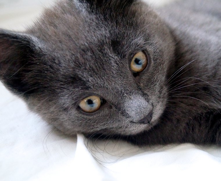 Vakker grå korthåret med silkemyk pels. Har ekstra tær foran og bak, som gir han store poter.