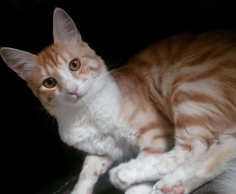 Rød og hvit med spotter på en side og tiger striper på den andre siden. Stor rufsete hale. Lang og silkemyk pels. Prater mye. noen pigment flekker på lepper. Veldig oransje øyer. Han er veldig sterk, og skeptisk til fremmede.