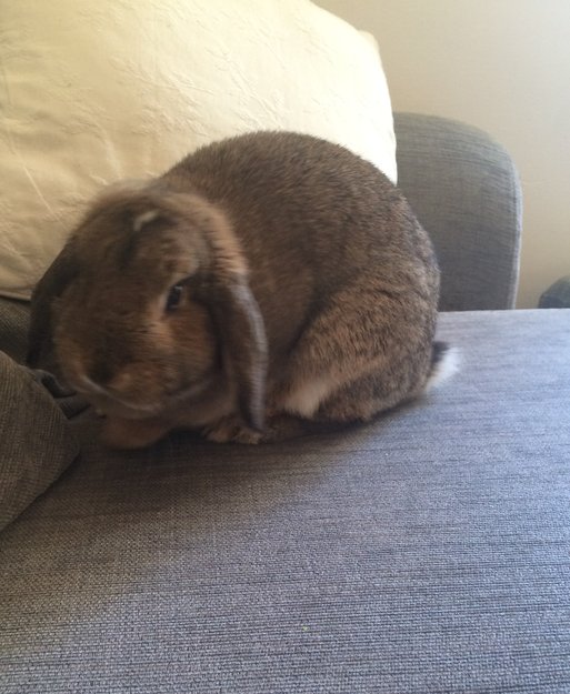 Brun pels med litt hvitt under halen og på på hodet. Tam og glad i kos