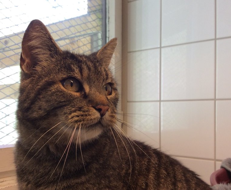 Snill. Kosete. Ganske stor, ca fem kilo selv om tynn. En knekt hjørnetann.