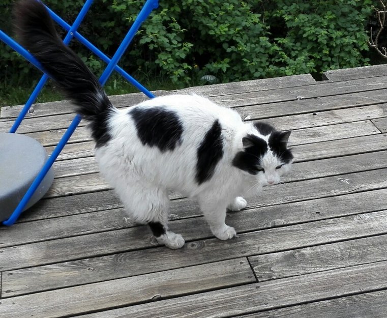 Katten har holdt til i området i ca 2 uker. Den vil lurer seg inn gjennom katteluken vår når vi ikke passer på. Veldig kosete.