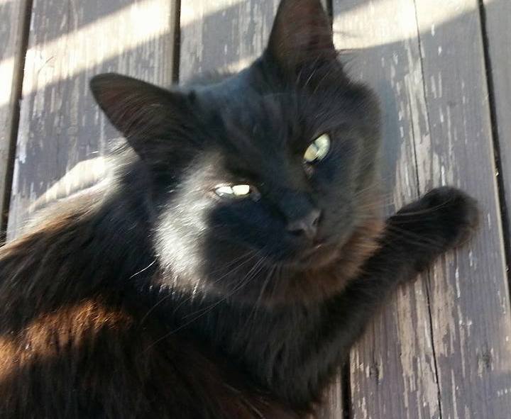 Den er svart med lang pels og har ikke halsbånd, er meget kjælen og har stor behov for selskap. Vi mener det er gutt. Har dessverre ikke mulighet til å beholde den, så håper eierne leser dette snart. Ta kontakt hvis du savner eller vet hvem den tilhører.