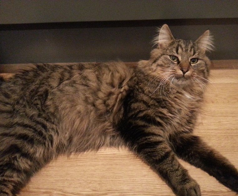 Stripete brun / grå og sort. Lang pels, og et flott ansikt. Har halsbånd med navn og nummer, men dette kan selsvagt ha falt av.