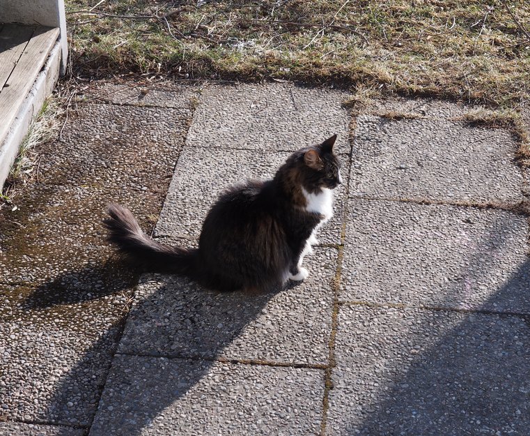 Malin lå plutselig innerst i uteboden i dag, hun ser ut til å ha vært innestengt et sted i over en uke. Lukter gressklipperbensin, er møkkete, tynnere og flokete. Var i boden et par timer tidligere, og da var hun ikke der. Hun gikk rett til matskåla etter å ha kost med og sjekket. Lykkelig slutt! :-)