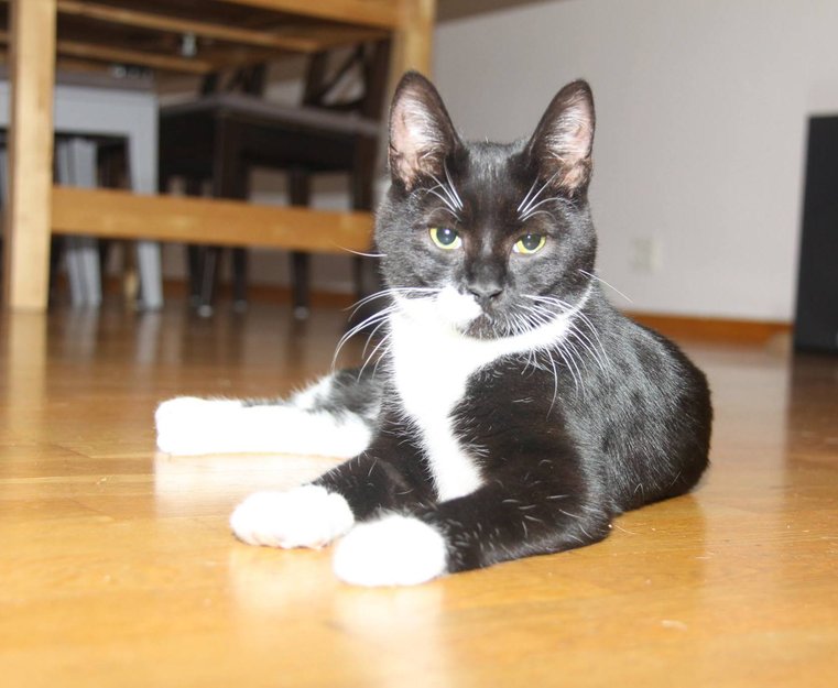 Hun har en hvit stripe i det svarte som går rundt på utsiden av venstre bakfot, hun er hvit under og hvite sokker.